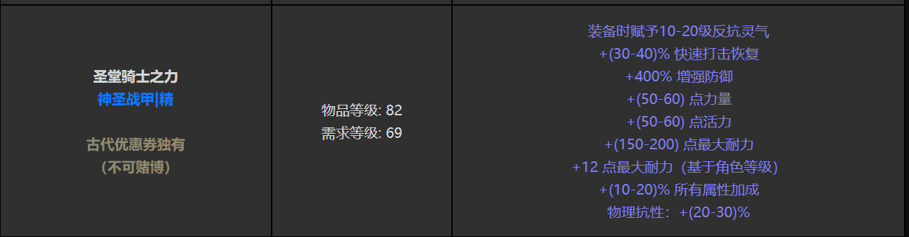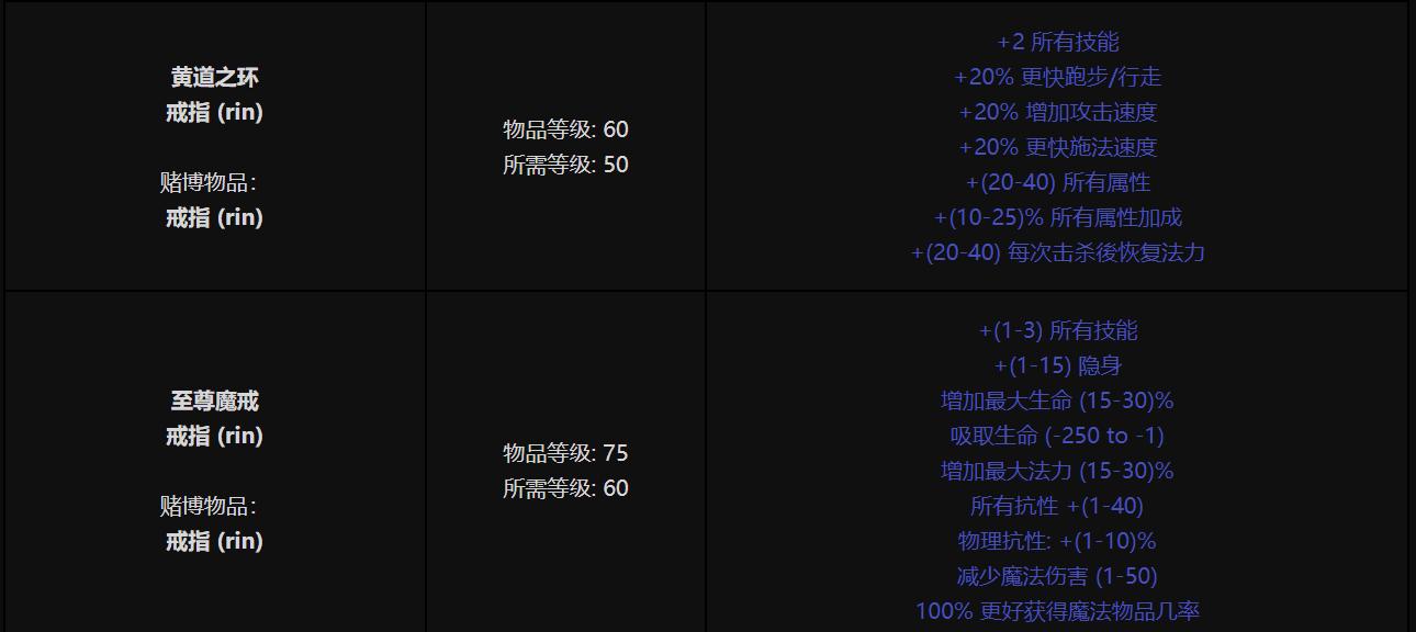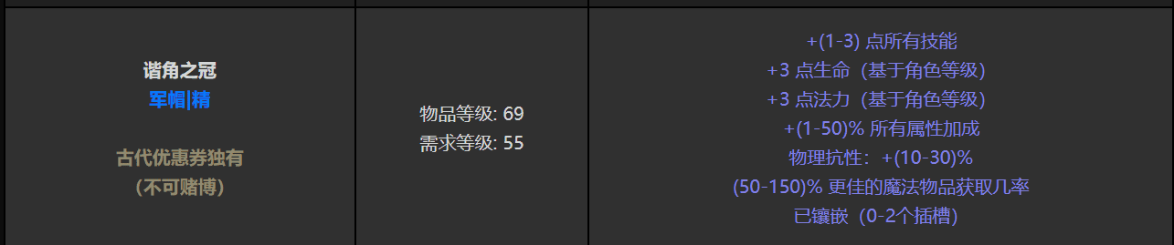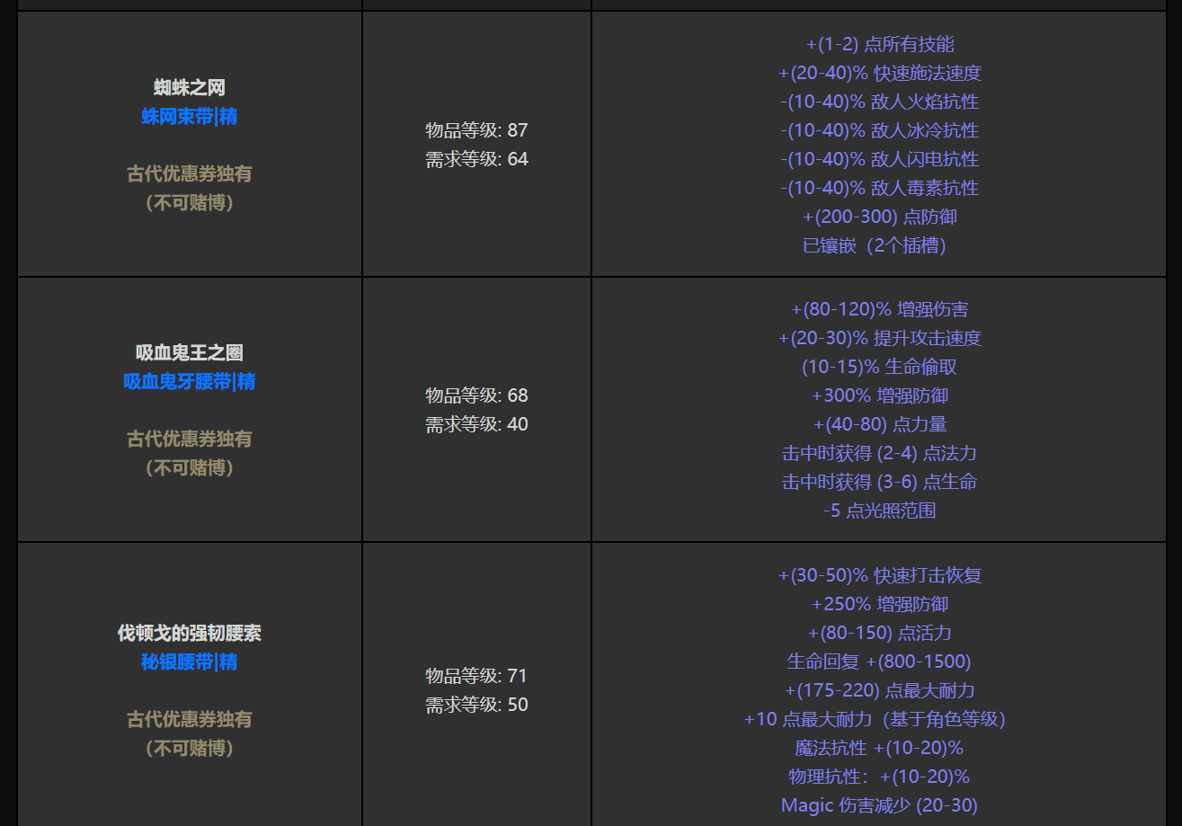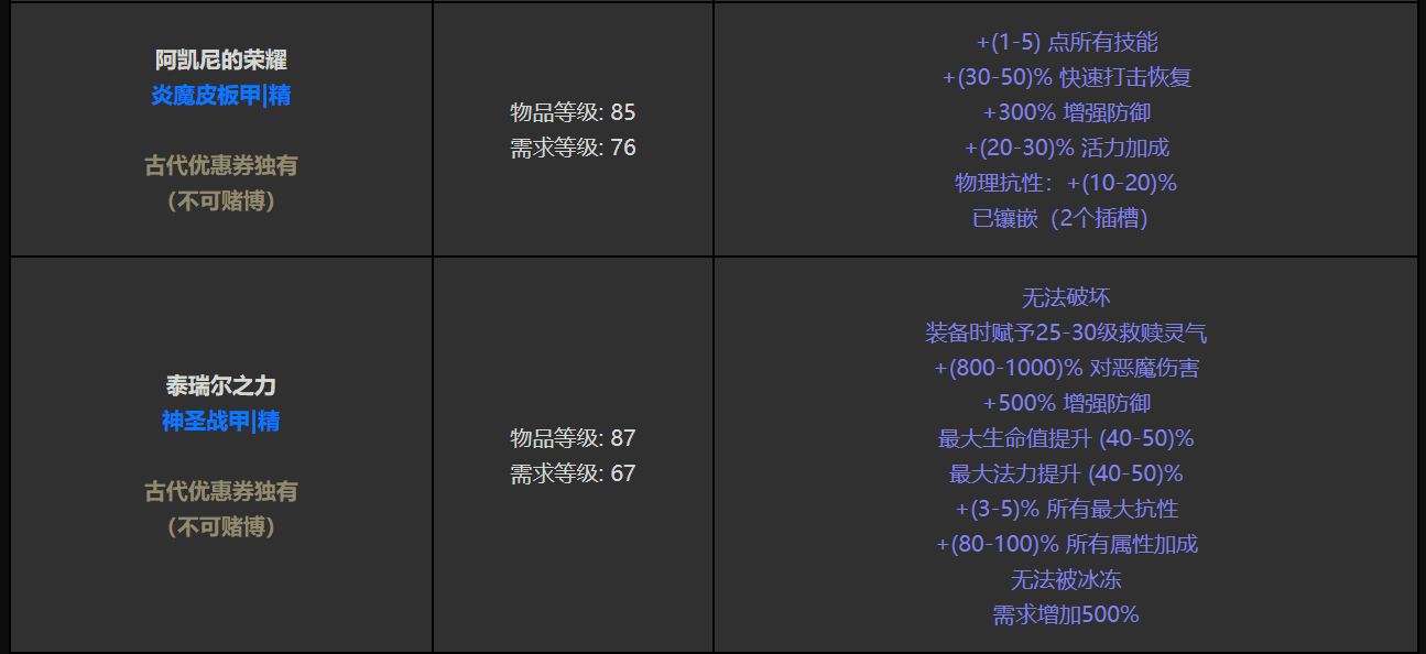 此mod原版暗金需要由优惠卷合成,极为难得,且属性巨强。其余可掉落暗金可作为过渡装备直接赌博出。由于过渡可选择装备太多不做罗列,请前往网页装备资讯中自行挑选。